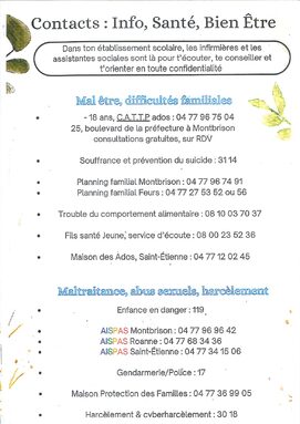 Par CHRISTOPHE TERRIER, publié le mardi 10 septembre 2024 14:23 - Mis à jour le mardi 10 septembre 2024 14:23Dans l'établissement, les infirmières et les assistantes sociales sont là pour t'écouter, te conseiller et t'orienter en toute confidentialité. En dehors de l'établissement, vous trouverez l'ensemble des contacts en pièce-jointe.