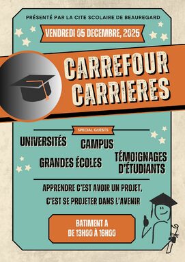 Par CHRISTOPHE TERRIER, publié le lundi 1 décembre 2025 08:14 - Mis à jour le lundi 1 décembre 2025 08:14Vendredi 5 décembre de 13h à 16h les élèves de Première et de Terminale pourront se renseigner sur de nombreuses formations, échanger avec des enseignants et d'anciens élèves de la cité scolaire de Beauregard. -