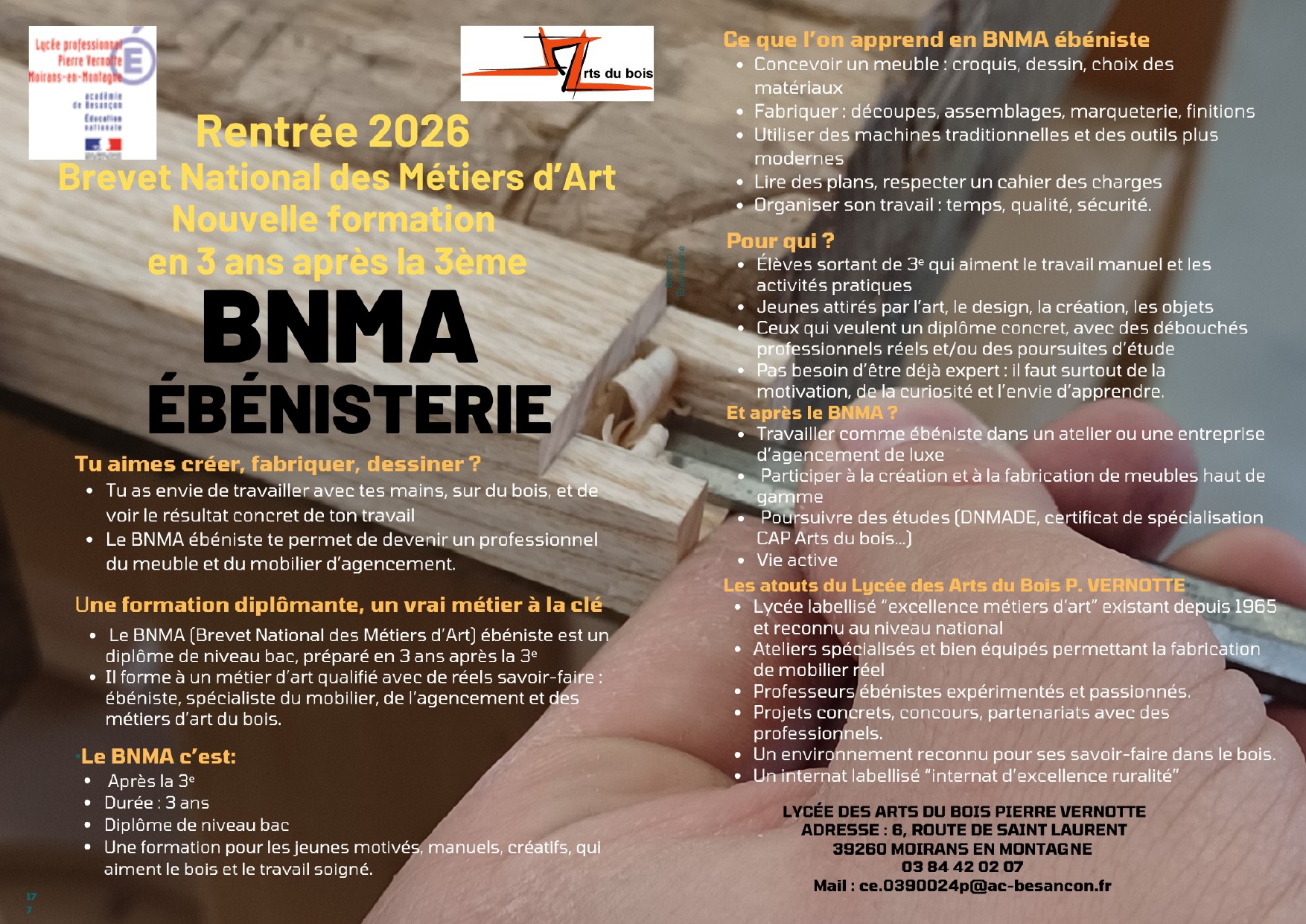 Brevet National des Métiers d'Art (BNMA) en Ébénisterie en 3 ans Cité scolaire Pierre VERNOTTE - Moirans-en-Montagne (Jura)