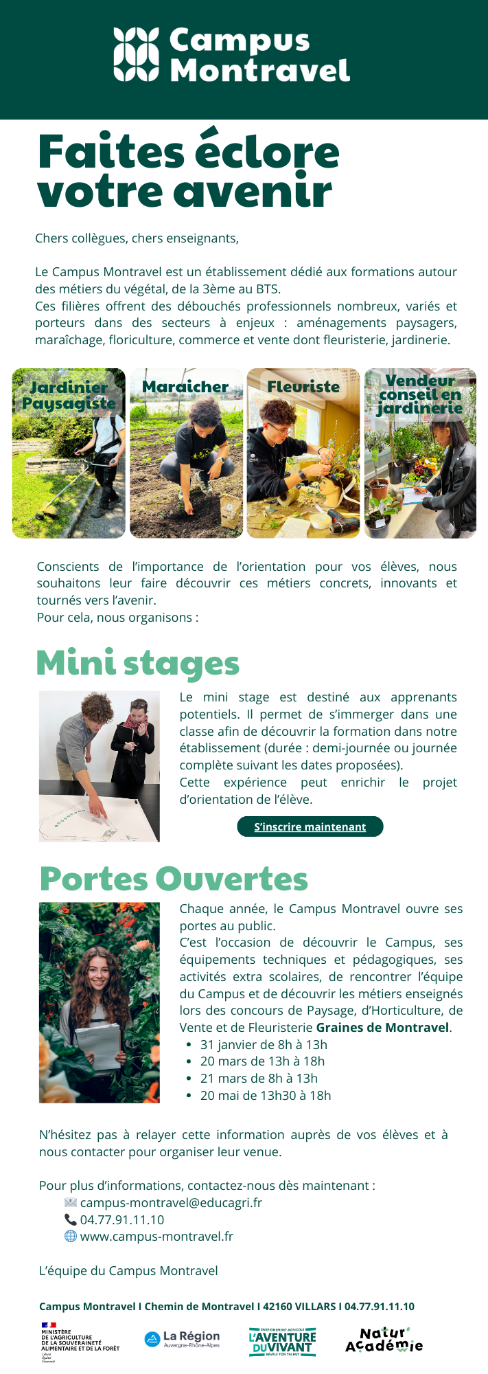 Le Campus de Montravel (lycée professionnel et CFA) vous propose 4journées portes ouvertes et des mini-stages (Horticulture, Paysage, Vente jardinerie, Fleuristerie, Maraîchage niveau CAP ou Bac pro).